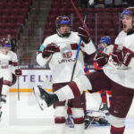 MINNEAPOLIS, USA, 31, Dec, 2025, World Juniors, CZE vs. LAT. Image shows Markuss SIERADZKIS #27 (Latvia), Olivers MURNIEKS #14 (Latvia) & Kristers ANSONS #17 (Latvia) after their 1:0 lead. Photo: Werner Krainbucher (Puckfans.at)