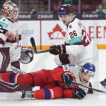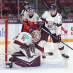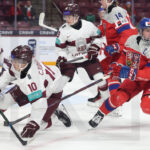 MINNEAPOLIS, USA, 31, Dec, 2025, World Juniors, CZE vs. LAT. Image shows Nils MAURINS #30 (Latvia), Harijs CJUNSKIS #10 (Latvia), Bruno OSMANIS #19 (Latvia) & Petr SIKORA #17 (Czech Republic). Photo: Werner Krainbucher (Puckfans.at)