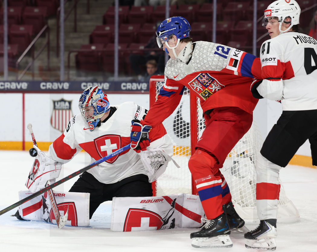 WK20260102_0922 3. Januar 2026 1050 × 834 PHOTO GALLERY WORLD JUNIORS 2026 CZE – SUI 6:2 MINNEAPOLIS, USA, 02, Jan, 2026, World Juniors, Quarterfinal, CZE vs. SUI. Image shows Christian KIRSCH #65 (Switzerland), Maximilian CURRAN #12 (Czech Republic) & Leon MUGGLI #41 (Switzerland). Photo: Werner Krainbucher
