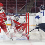 MINNEAPOLIS, USA, 26, Dec, 2025, World Juniors, DEN vs. FIN. Image shows Jasper KUHTA #29 (Finland), Jesper OLESEN #8 (Denmark), Anton WILDE #1 (Denmark), Viggo DAMGAARD #21 (Denmark) & Leo TUUVA #23 (Finland). Photo: Werner Krainbucher (Puckfans.at)
