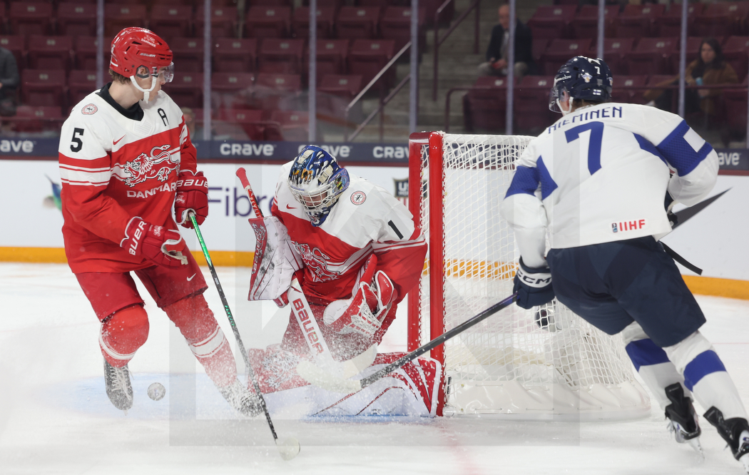 MINNEAPOLIS, USA, 26, Dec, 2025, World Juniors, DEN vs. FIN. Image shows Markus JAKOBSEN #5 (Denmark), Joona SAARELAINEN #12 (Finland) & Anton WILDE #1 (Denmark). Photo: Werner Krainbucher (Puckfans.at)