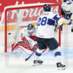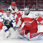 MINNEAPOLIS, USA, 26, Dec, 2025, World Juniors, DEN vs. FIN. Image shows Anton WILDE #1 (Denmark) & Heikki RUOHONEN #28 (Finland). Photo: Werner Krainbucher (Puckfans.at)