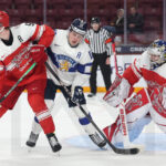 MINNEAPOLIS, USA, 26, Dec, 2025, World Juniors, DEN vs. FIN. Image shows Joona SAARELAINEN #12 (Finland), Albert GROSSMANN #12 (Denmark) & Anton WILDE #1 (Denmark). Photo: Werner Krainbucher (Puckfans.at)