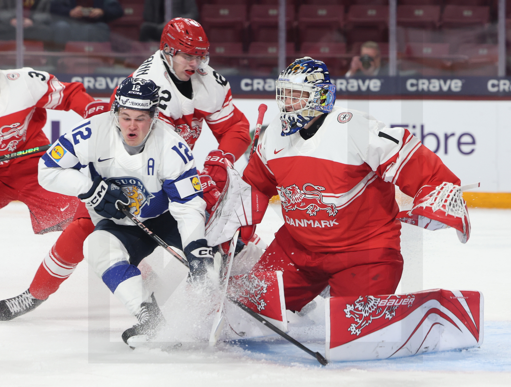 MINNEAPOLIS, USA, 26, Dec, 2025, World Juniors, DEN vs. FIN. Image shows Joona SAARELAINEN #12 (Finland), Albert GROSSMANN #12 (Denmark) & Anton WILDE #1 (Denmark). Photo: Werner Krainbucher (Puckfans.at)