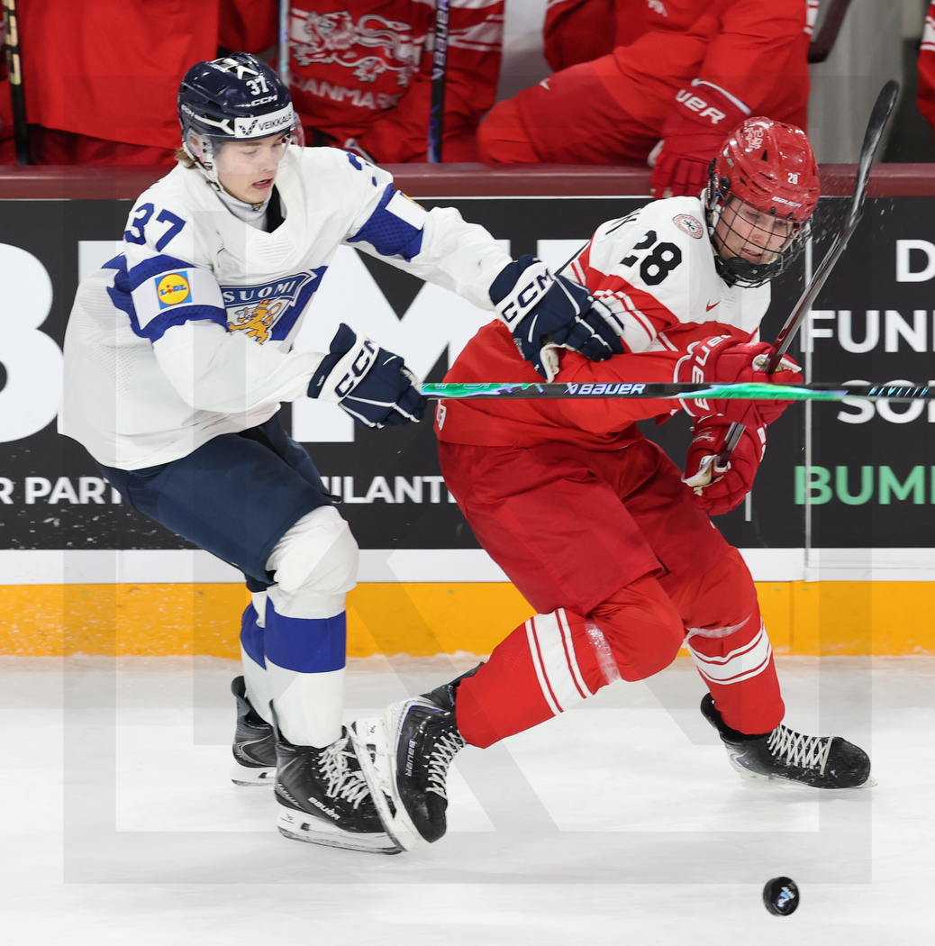 MINNEAPOLIS, USA, 26, Dec, 2025, World Juniors, DEN vs. FIN. Image shows Matias VANHANEN #37 (Finland) & Martinus Uggerhoj SCHIOLDAN #28 (Denmark). Photo: Werner Krainbucher (Puckfans.at)