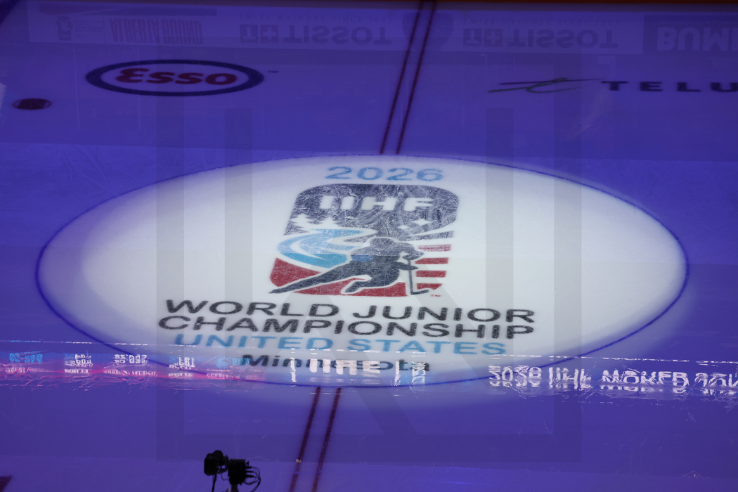 MINNEAPOLIS, USA, 29, Dec, 2025, World Juniors, FIN vs. CZE. Image shows the championship logo in the middle of the ice. Photo: Werner Krainbucher