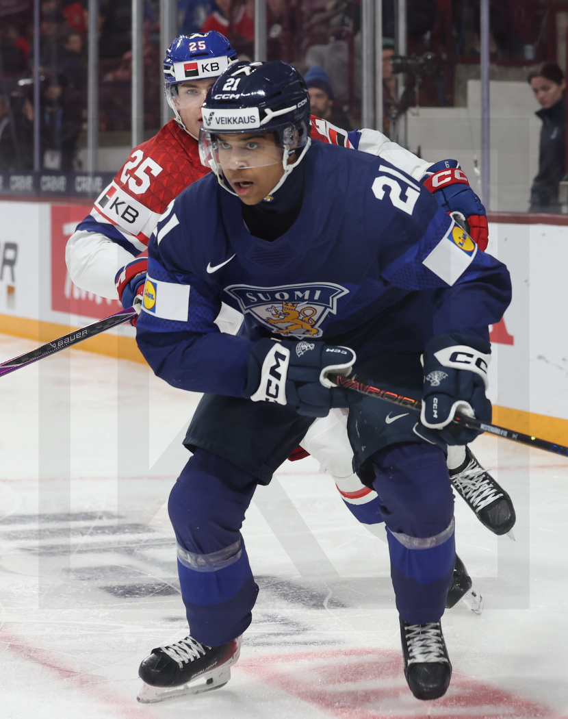 MINNEAPOLIS, USA, 29, Dec, 2025, World Juniors, FIN vs. CZE. Image shows Stepan HOCH #25 (Czech Republic) & Max WESTERGARD #21 (Finland). Photo: Werner Krainbucher