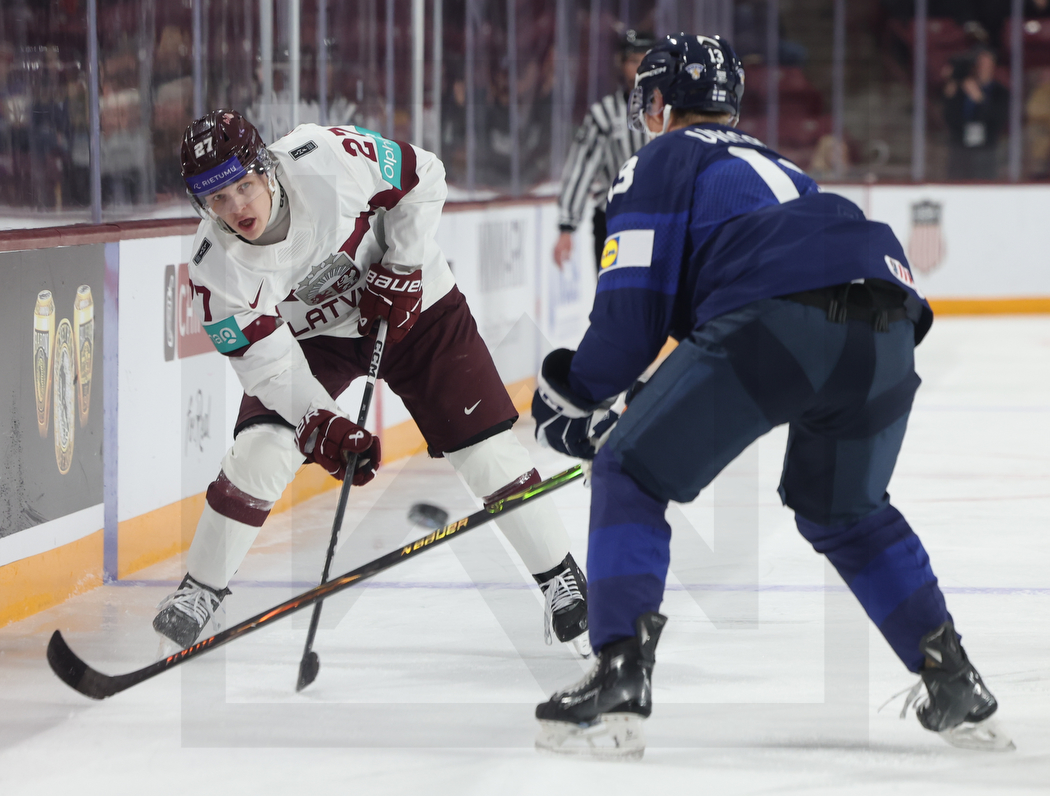 WK20251228_0201 29. Dezember 2025 1050 × 796 PHOTO GALLERY WORLD JUNIORS 2026 FIN – LAT 8:0 MINNEAPOLIS, USA, 28, Dec, 2025, World Juniors, FIN vs. LAT. Image shows Markuss SIERADZKIS #27 (Latvia) & Veto VÄISÄNEN #13 (Finland). Photo: Werner Krainbucher