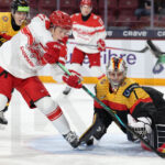 MINNEAPOLIS, USA, 02, Jan, 2026, World Juniors, Relegation Round, GER vs. DEN. Image shows Max HENSE #8 (Germany), William BUNGAARD #19 (Denmark) & Linus VIELLARD #1 (Germany). Photo: Werner Krainbucher