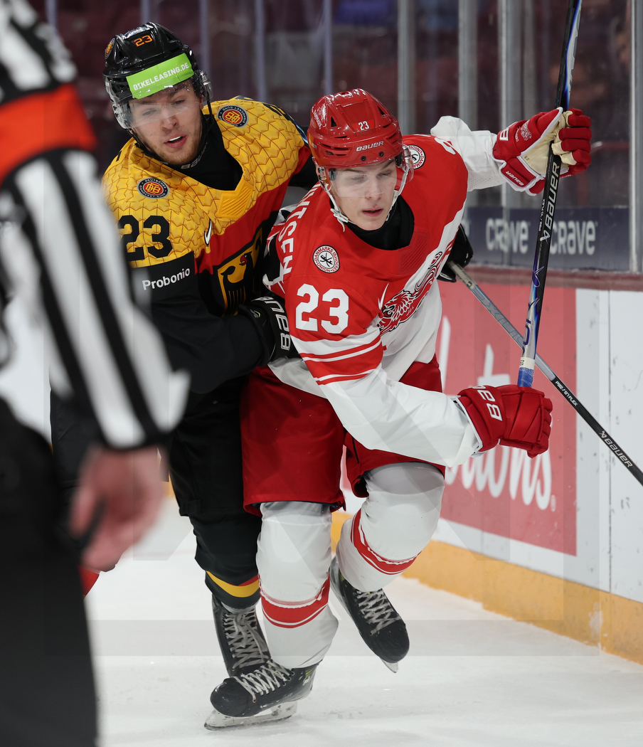 WK20260102_0213 2. Januar 2026 904 × 1050 PHOTO GALLERY WORLD JUNIORS 2026 GER – DEN 8:4 MINNEAPOLIS, USA, 02, Jan, 2026, World Juniors, Relegation Round, GER vs. DEN. Image shows Matthias PAPE #23 (Germany) & Lasse BAERENTSEN #23 (Denmark). Photo: Werner Krainbucher