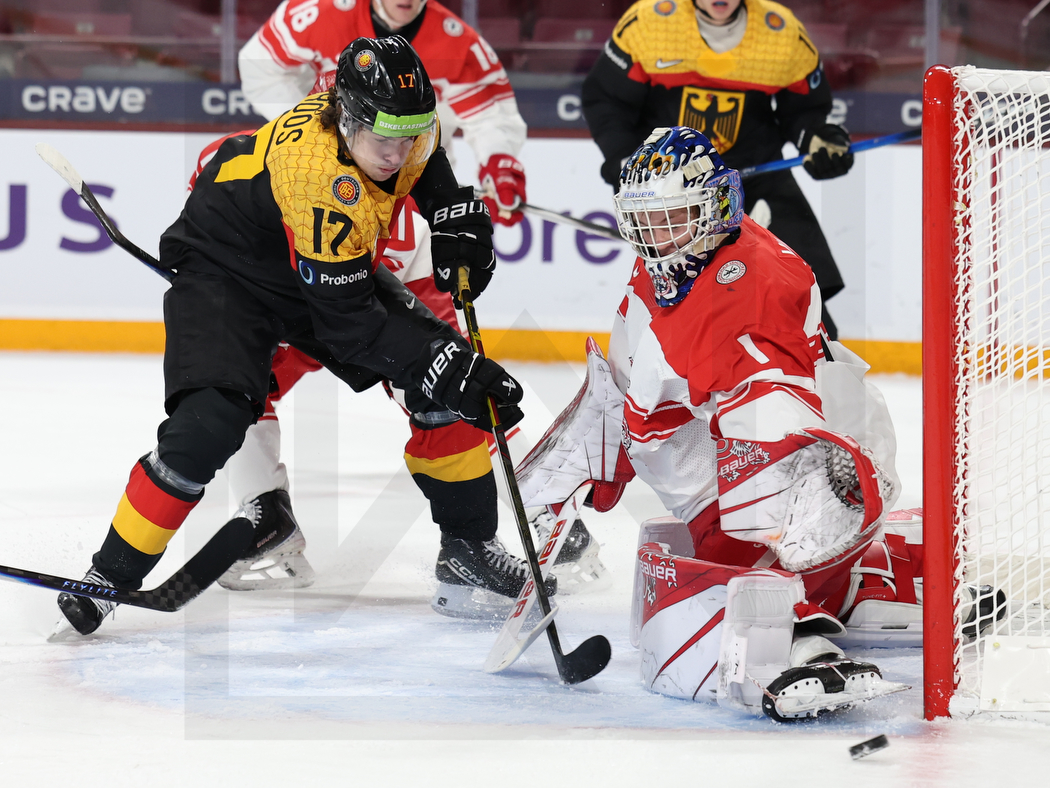 MINNEAPOLIS, USA, 02, Jan, 2026, World Juniors, Relegation Round, GER vs. DEN. Image shows Lenny BOOS #17 (Germany) & Anton WILDE #1 (Denmark). Photo: Werner Krainbucher