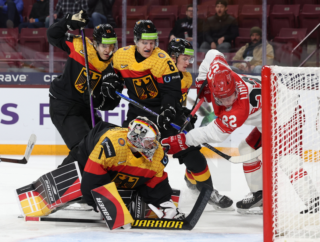 MINNEAPOLIS, USA, 02, Jan, 2026, World Juniors, Relegation Round, GER vs. DEN. Image shows Mateu SPATH MARISCAL #15 (Germany), Manuel SCHAMS #6 (Germany), Linus VIELLARD #1 (Germany), Carlos HÄNDEL #7 (Germany) & Anton LINDE #22 (Denmark). Photo: Werner Krainbucher