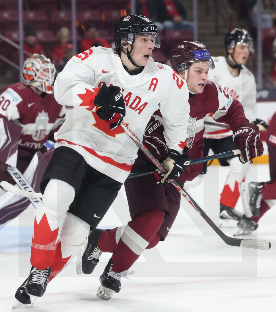 MINNEAPOLIS, USA, 27, Dec, 2025, World Juniors, LAT vs. CAN. Image shows Cole BEAUDOIN #26 (Canada) & Karlis FLUGINS #28 (Latvia). Photo: Werner Krainbucher (Puckfans.at)