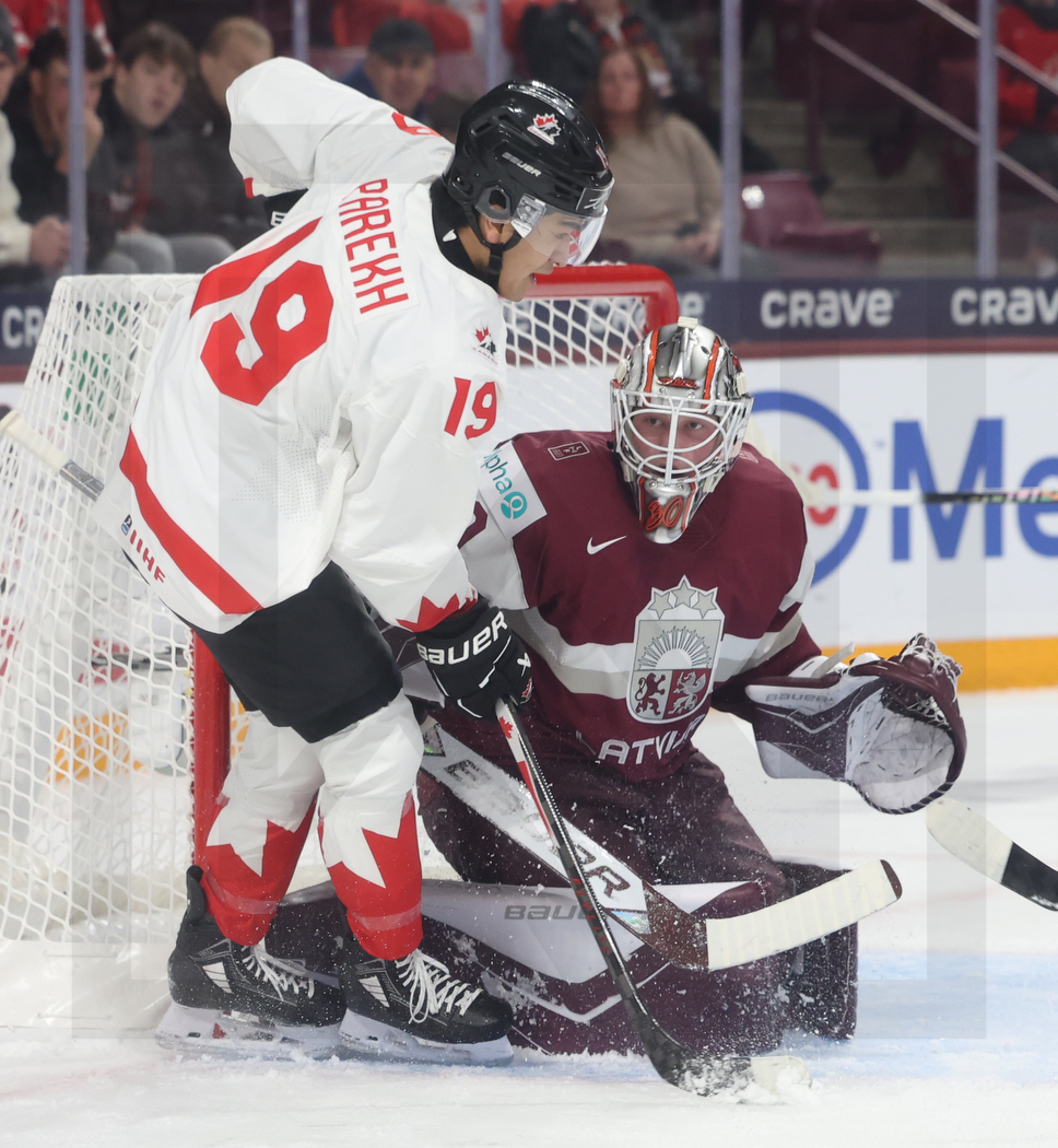 MINNEAPOLIS, USA, 27, Dec, 2025, World Juniors, LAT vs. CAN. Image shows Zayne PAREKH #19 (Canada) & Nils MAURINS #30 (Latvia). Photo: Werner Krainbucher (Puckfans.at)