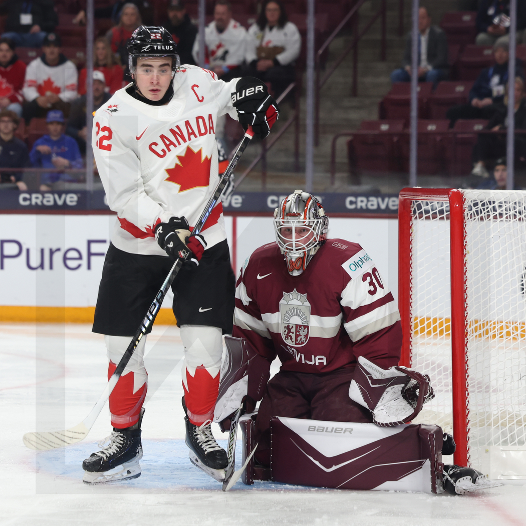MINNEAPOLIS, USA, 27, Dec, 2025, World Juniors, LAT vs. CAN. Image shows Porter MARTONE #22 (Canada) & Nils MAURINS #30 (Latvia). Photo: Werner Krainbucher (Puckfans.at)