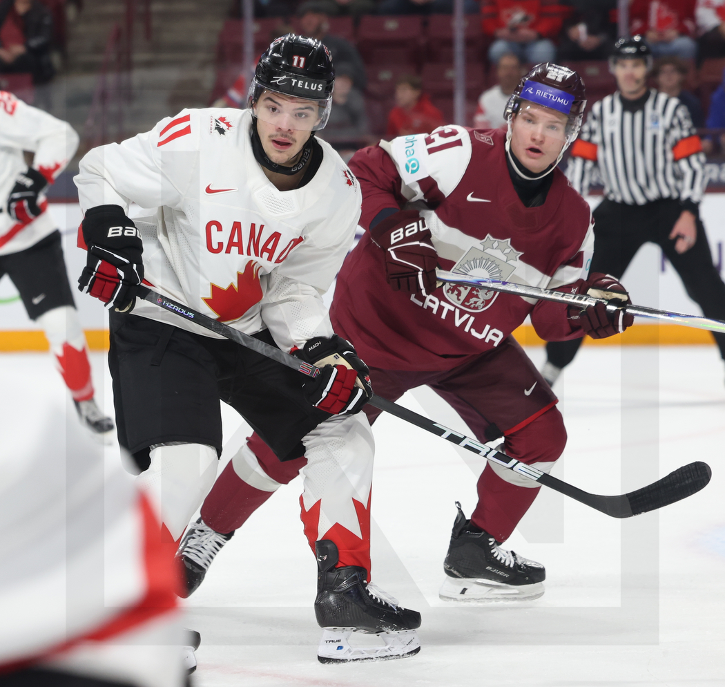 MINNEAPOLIS, USA, 27, Dec, 2025, World Juniors, LAT vs. CAN. Image shows Tij IGINLA #11 (Canada) & Krists RETENAIS #21 (Latvia). Photo: Werner Krainbucher (Puckfans.at)