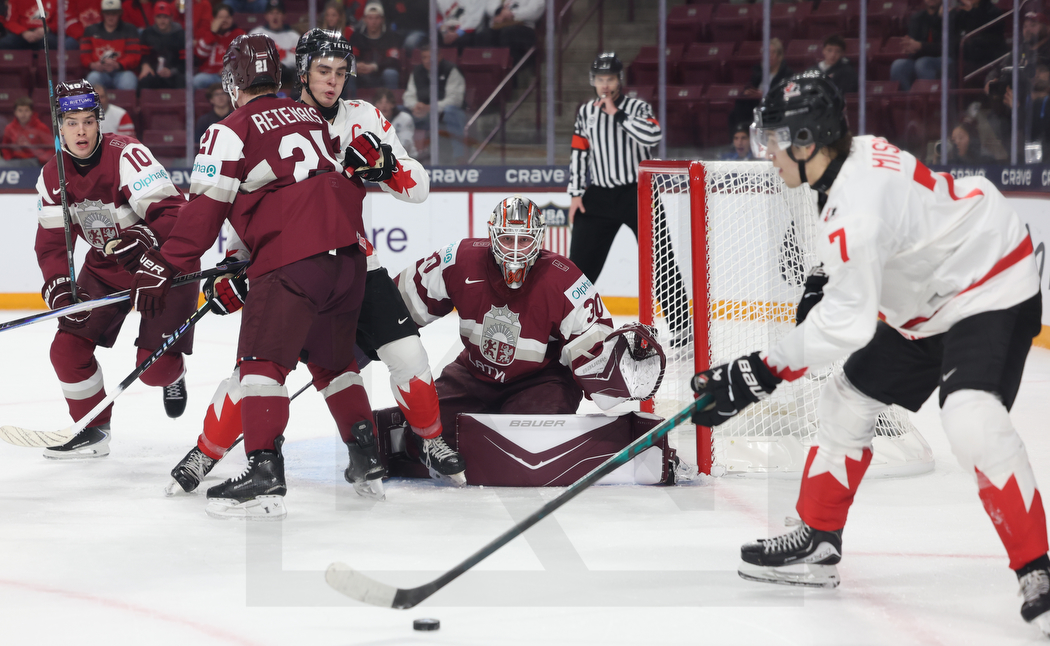 MINNEAPOLIS, USA, 27, Dec, 2025, World Juniors, LAT vs. CAN. Image shows Harijs CJUNSKIS #10 (Latvia), Krists RETENAIS #21 (Latvia), Porter MARTONE #22 (Canada), Nils MAURINS #30 (Latvia) & Michael MISA #7 (Canada). Photo: Werner Krainbucher (Puckfans.at)
