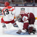 MINNEAPOLIS, USA, 30, Dec, 2025, World Juniors, LAT vs. DEN. Image shows Oliver LARSEN #13 (Denmark) & Nils MAURINS #30 (Latvia). Photo: Werner Krainbucher (Puckfans.at)