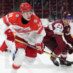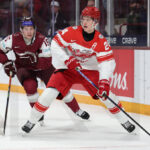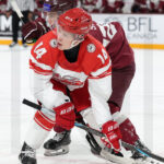 MINNEAPOLIS, USA, 30, Dec, 2025, World Juniors, LAT vs. DEN. Image shows William BUNGAARD #19 (Denmark) & Alberts SMITS #23 (Latvia). Photo: Werner Krainbucher (Puckfans.at)