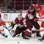 MINNEAPOLIS, USA, 30, Dec, 2025, World Juniors, LAT vs. DEN. Image shows Markuss SIERADZKIS #27 (Latvia), Lucas CILAN #17 (Denmark) & Nils MAURINS #30 (Latvia). Photo: Werner Krainbucher (Puckfans.at)