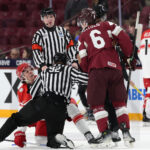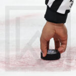 MINNEAPOLIS, USA, 30, Dec, 2025, World Juniors, LAT vs. DEN. Image shows linesman getting the game puck. Photo: Werner Krainbucher (Puckfans.at)