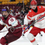 MINNEAPOLIS, USA, 30, Dec, 2025, World Juniors, LAT vs. DEN. Image shows Roberts NAUDINS #18 (Latvia) & Albert GROSSMANN #12 (Denmark). Photo: Werner Krainbucher (Puckfans.at)