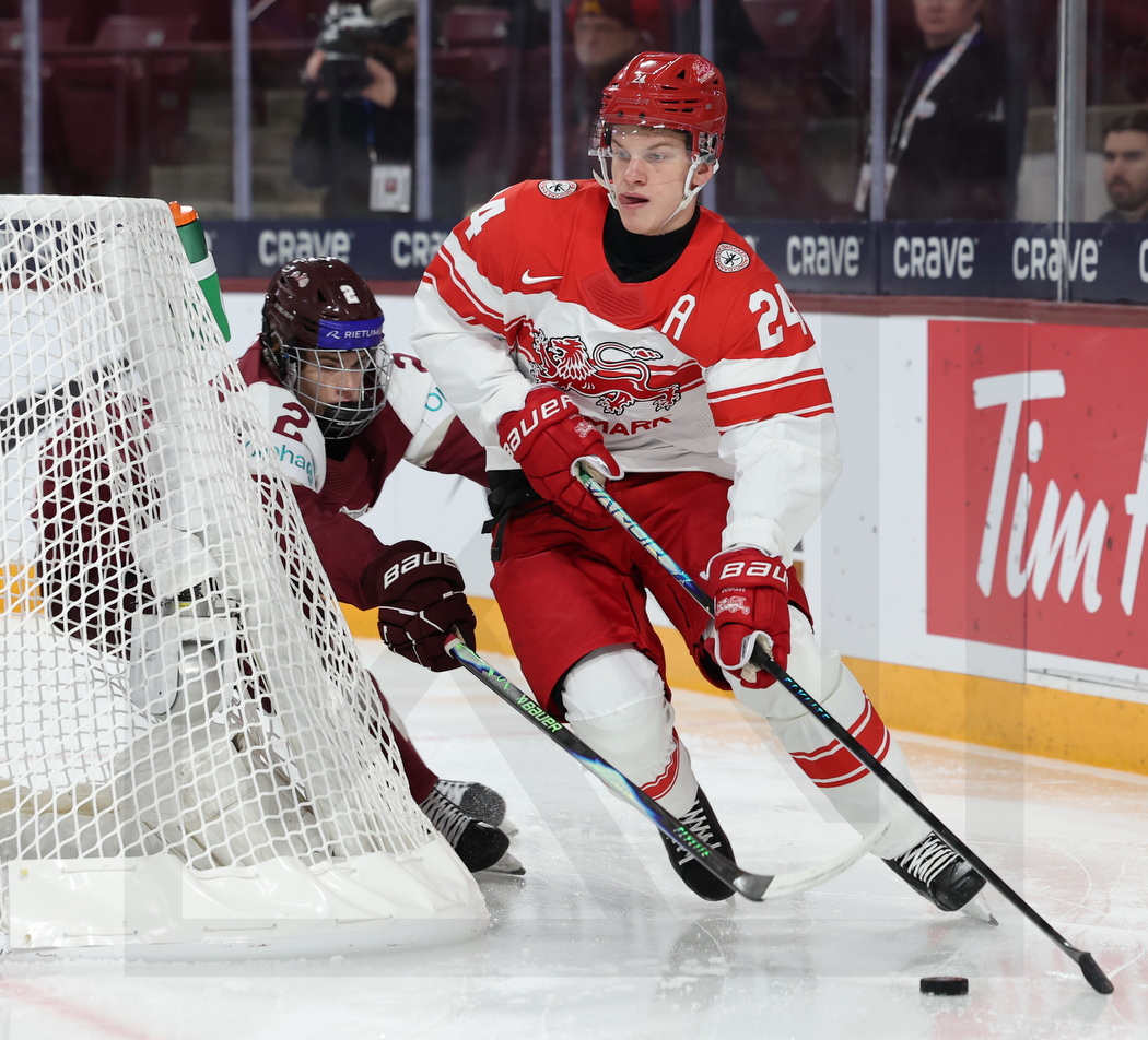WK20251230_0004 31. Dezember 2025 1050 × 952 PHOTO GALLERY WORLD JUNIORS 2026 LAT – DEN 6:3 MINNEAPOLIS, USA, 30, Dec, 2025, World Juniors, LAT vs. DEN. Image shows Krisjanis SARTS #2 (Latvia) & Mads KLYVO #24 (Denmark). Photo: Werner Krainbucher (Puckfans.at)