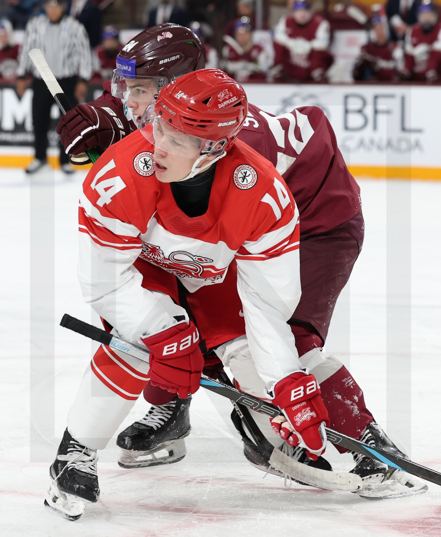 WK20251230_0044 31. Dezember 2025 864 × 1050 PHOTO GALLERY WORLD JUNIORS 2026 LAT – DEN 6:3 MINNEAPOLIS, USA, 30, Dec, 2025, World Juniors, LAT vs. DEN. Image shows Oliver GREEN #14 (Denmark) & Daniels SERKINS #24 (Latvia). Photo: Werner Krainbucher (Puckfans.at)