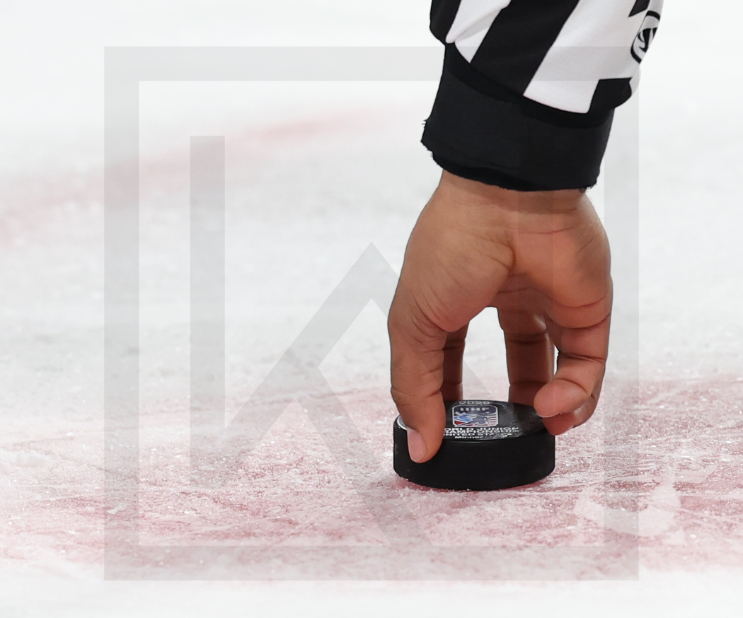 MINNEAPOLIS, USA, 30, Dec, 2025, World Juniors, LAT vs. DEN. Image shows linesman getting the game puck. Photo: Werner Krainbucher (Puckfans.at)