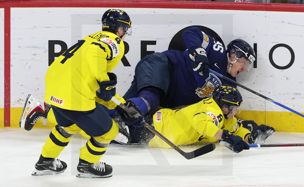 ST. PAUL, USA, 04, Jan, 2026, World Juniors, Semifinals, SWE vs. FIN. Image shows Leo SAHLIN WALLENIUS #4 (Sweden), Atte JOKI #35 (Finland) & Felix CARELL #8 (Sweden). Photo: Werner Krainbucher