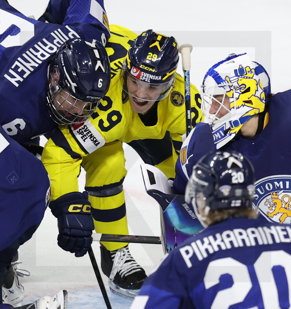 ST. PAUL, USA, 04, Jan, 2026, World Juniors, Semifinals, SWE vs. FIN. Image shows Juho PIIPARINEN #6 (Finland), Casper JUUSTOVAARA #29 (Sweden) & Petteri RIMPINEN #30 (Finland). Photo: Werner Krainbucher