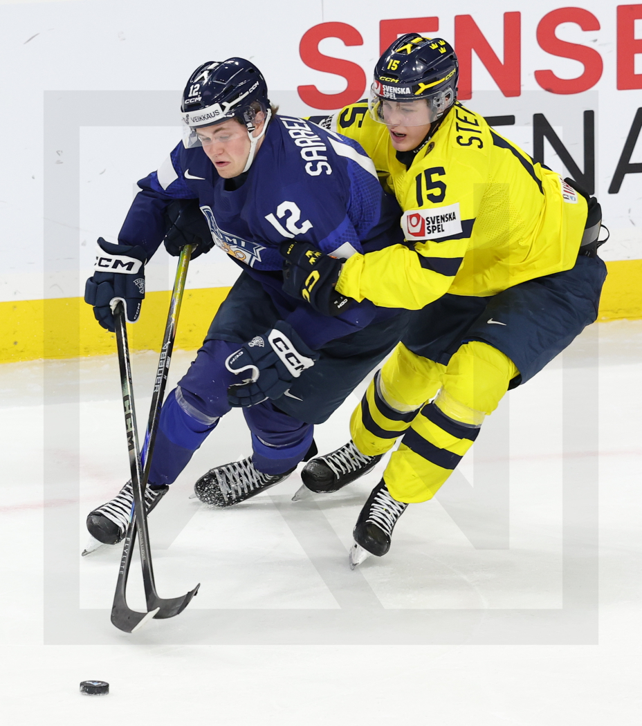 ST. PAUL, USA, 04, Jan, 2026, World Juniors, Semifinals, SWE vs. FIN. Image shows Joona SAARELAINEN #12 (Finland) & Ivar STENBERG #15 (Sweden). Photo: Werner Krainbucher