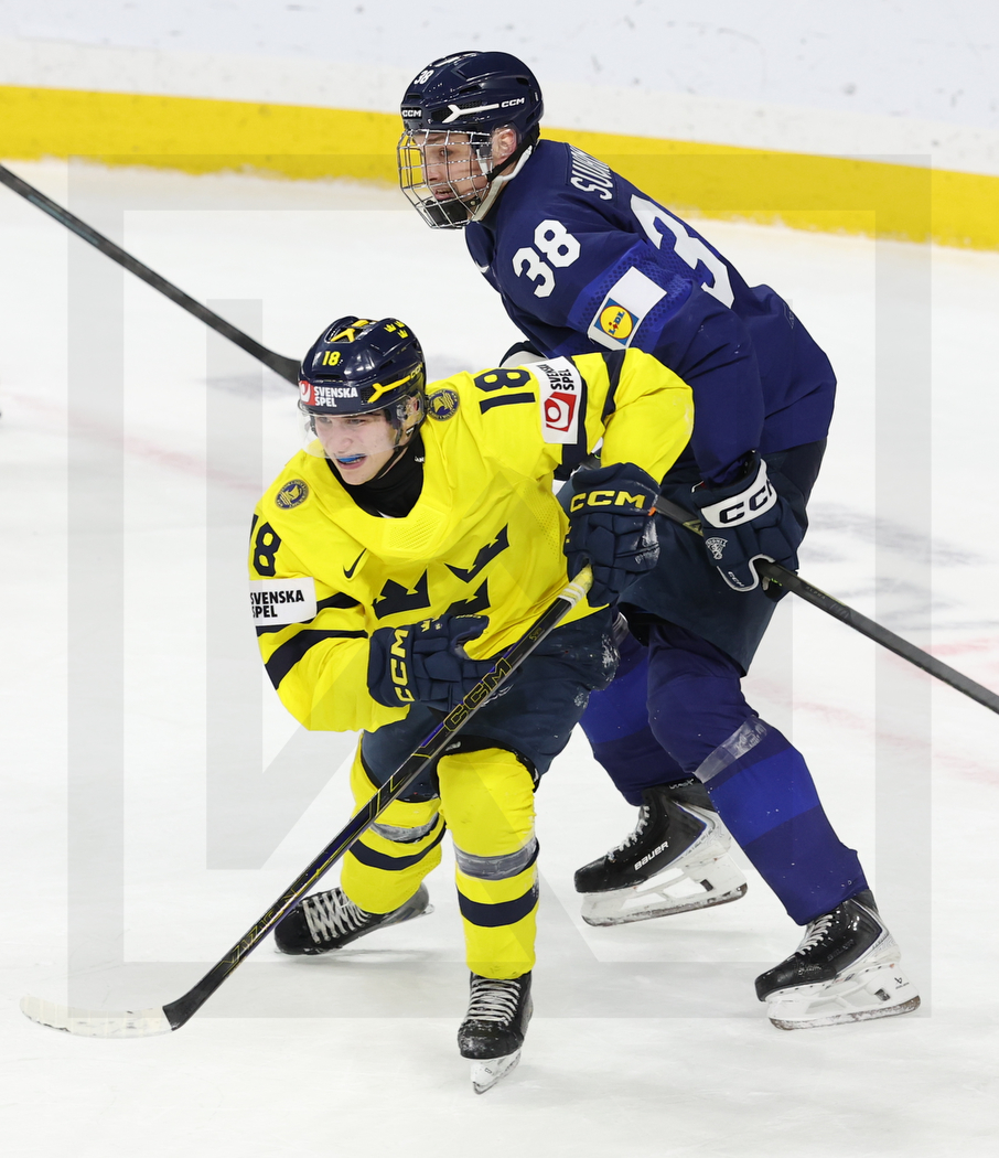 ST. PAUL, USA, 04, Jan, 2026, World Juniors, Semifinals, SWE vs. FIN. Image shows Victor EKLUND #18 (Sweden) & Oliver SUVANTO #38 (Finland). Photo: Werner Krainbucher