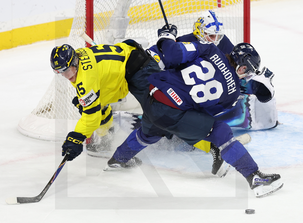 ST. PAUL, USA, 04, Jan, 2026, World Juniors, Semifinals, SWE vs. FIN. Image shows Ivar STENBERG #15 (Sweden), Petteri RIMPINEN #30 (Finland) & Heikki RUOHONEN #28 (Finland). Photo: Werner Krainbucher
