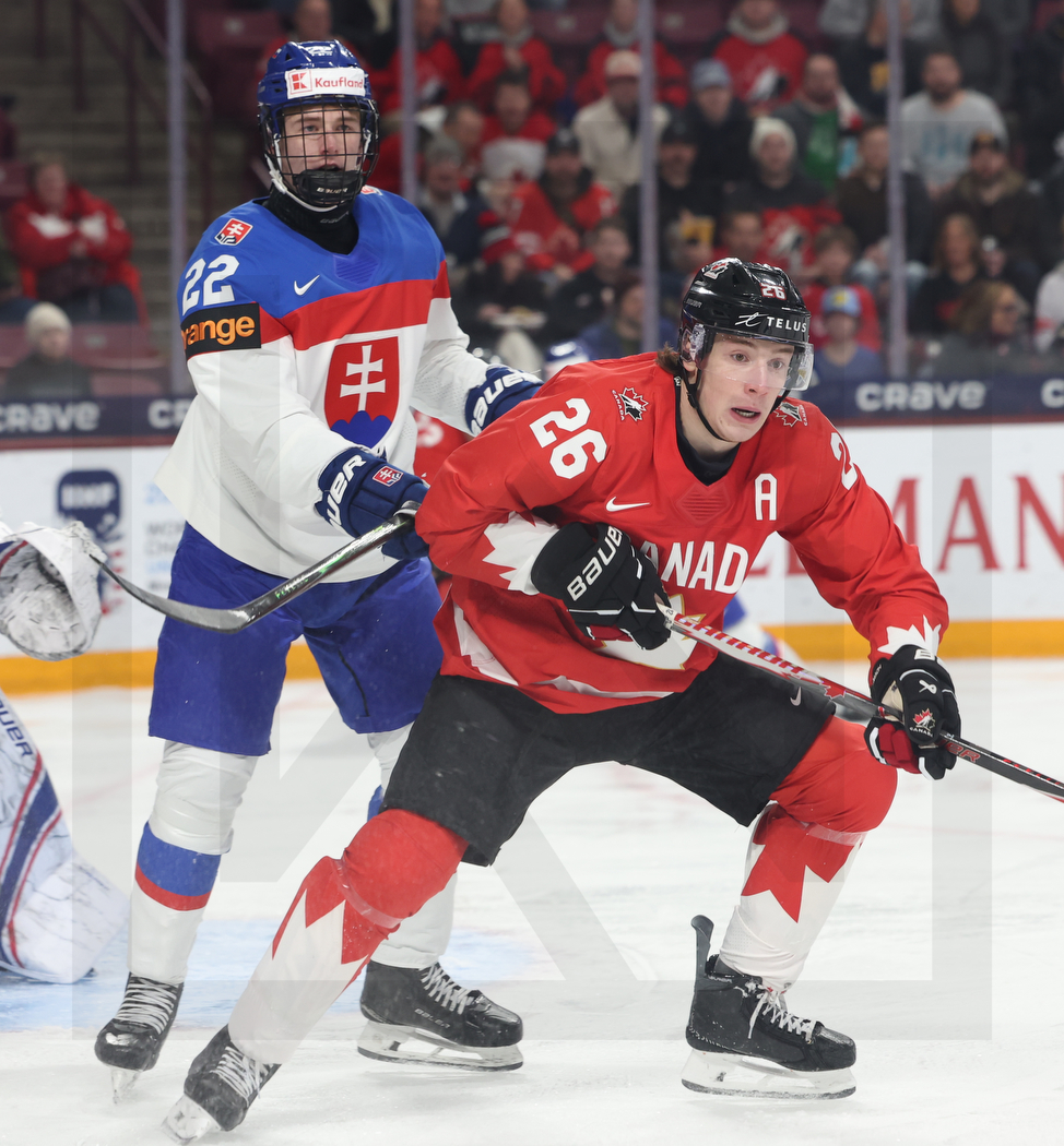 MINNEAPOLIS, USA, 02, Jan, 2026, World Juniors, Quarterfinal, CAN vs. SVK. Image shows Adam GOLJER #22 (Slovakia) & Cole BEAUDOIN #26 (Canada). Photo: Werner Krainbucher (Puckfans.at)