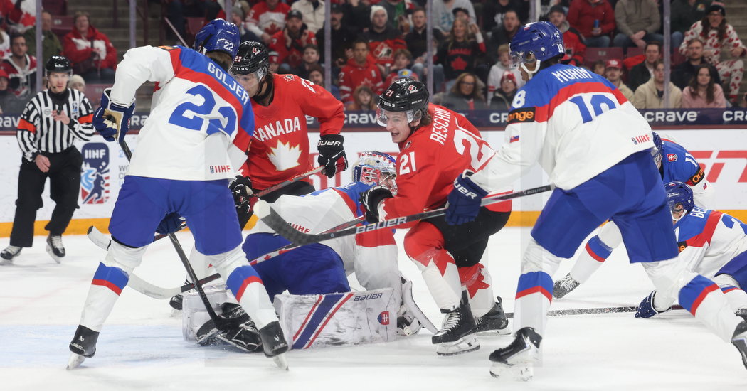 MINNEAPOLIS, USA, 02, Jan, 2026, World Juniors, Quarterfinal, CAN vs. SVK. Image shows Adam GOLJER #22 (Slovakia), Sam O’REILLY #23 (Canada), Michal PRADEL #1 (Slovakia), Cole RESCHNY #21 (Canada) & Samuel MURIN #18 (Slovakia). Photo: Werner Krainbucher (Puckfans.at)