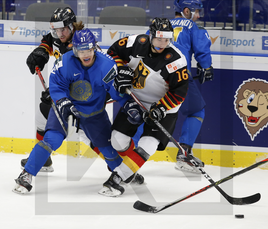 OSTRAVA, CZECH REPUBLIC, 04.Jan. 2020 – World Juniors, Relegation Round, KAZ vs. GER. Image shows Niklas HEINZINGER #6 (Germany), Alikhan OMIRBEKOV (Kazakhstan), Nino KINDER #16 & Yusup ASUKHANOV (Kazakhstan). Photo: Werner Krainbucher