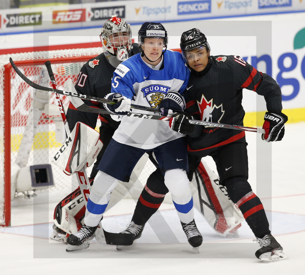 OSTRAVA, CZECH REPUBLIC, 04.Jan. 2020 – World Juniors, Semifinals, CAN vs. FIN. Image shows Joel HOFER #30 (Canada), Aku RÄTY #35 (Finland) & Akil THOMAS #16 (Canada). Photo: Werner Krainbucher