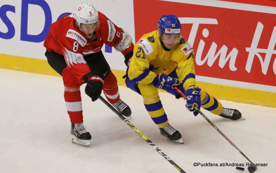 6T4A5882 28. Dezember 2019 900 × 564 Photo Gallery World Juniors SUI – SWE 2:5 World Juniors: SUI – SWE Janis Moser #8, Nils Höglander #21 Werk Arena, Trinec ©Puckfans.at/Andreas Robanser
