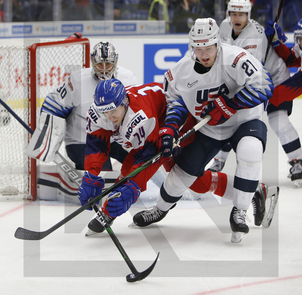 WK20191230_01085 30. Dezember 2019 1024 × 1000 PHOTO GALLERY: World Juniors, USA vs. CZE 4:3 OT, 30.12.2019 OSTRAVA, CZECH REPUBLIC, 30.Dec. 2019 – World Juniors, Preliminary Round, USA vs. CZE. Image shows Spencer KNIGHT #30 (USA), Jan JENIK #14 (Czech Republic) & Ty EMBERSON #21 (USA). Photo: Werner Krainbucher