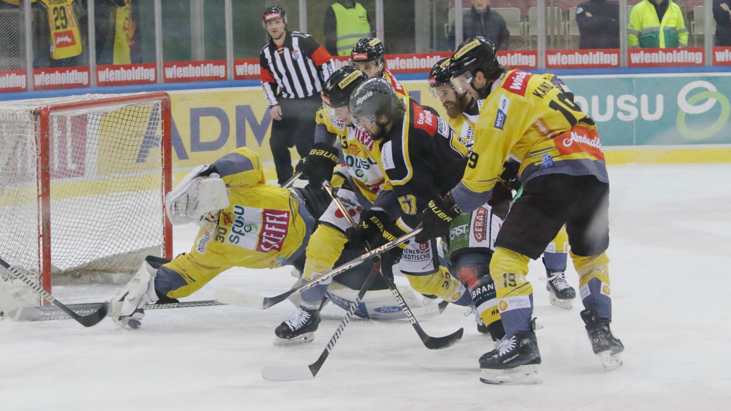 6T4A0336 12. Januar 2024 2560 × 1440 Pustertal bleibt gegen Wien weiter siegreich ICEHL Round 39 Vienna Capitals – HC Pustertal Sebastian Wraneschitz #30, Seamus Donohue #33, Mikael Frycklund #67, Lukas Kainz #19 Steffl Arena, © Puckfans.at / Andreas Robanser