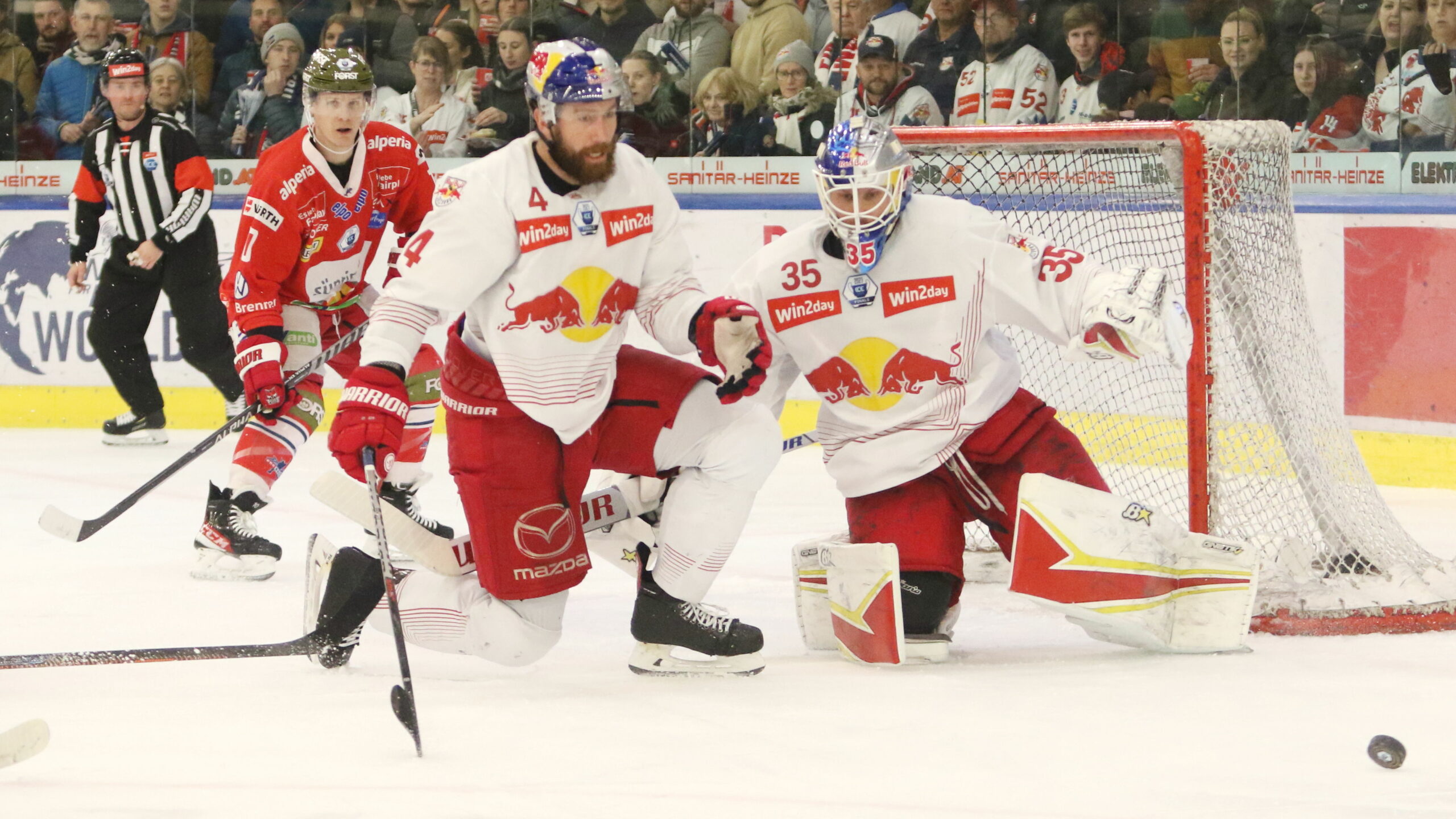 6T4A7695 14. April 2023 2560 × 1440 Salzburg benötigt noch einen Sieg ICEHL Final Game 4 EC Red Bull Salzburg – HCB Südtirol Dustin Gazley #10, Andrew MacWilliam #4, Atte Tolvanen #35 Eisarena Salzburg © Puckfans.at / Andreas Robanser