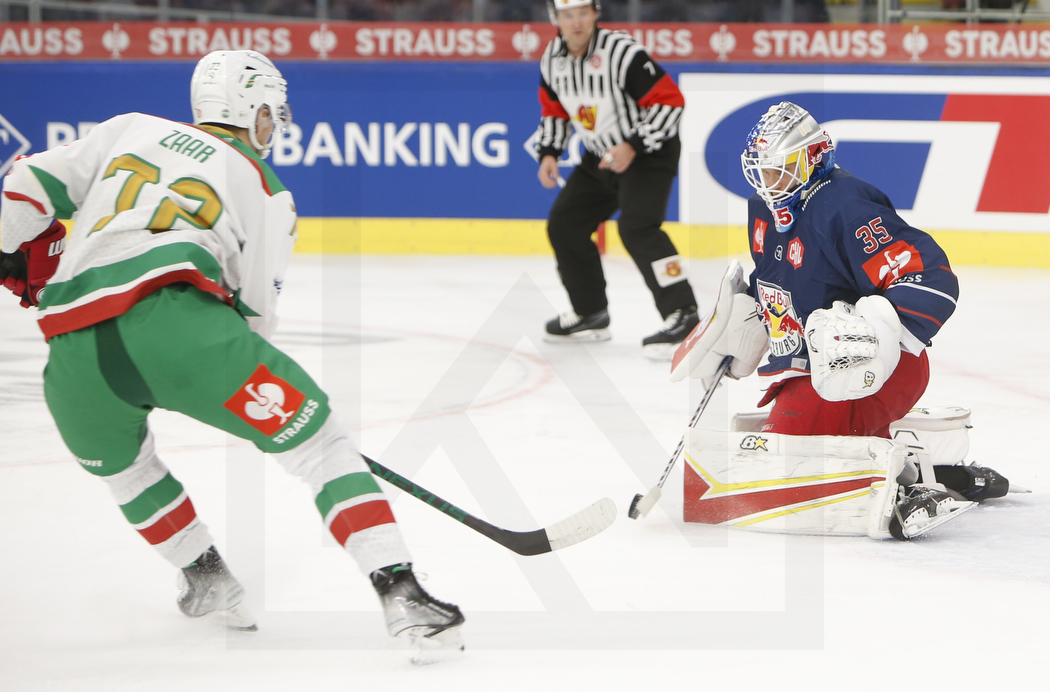 SALZBURG, AUSTRIA, 15.Nov. 2022 – EC Red Bull Salzburg vs. Rögle Ängelholm. Image shows Daniel ZAAR #72 (Rögle Ängelholm) & Atte TOLVANEN #35 (EC Red Bull Salzburg). Photo: Werner Krainbucher