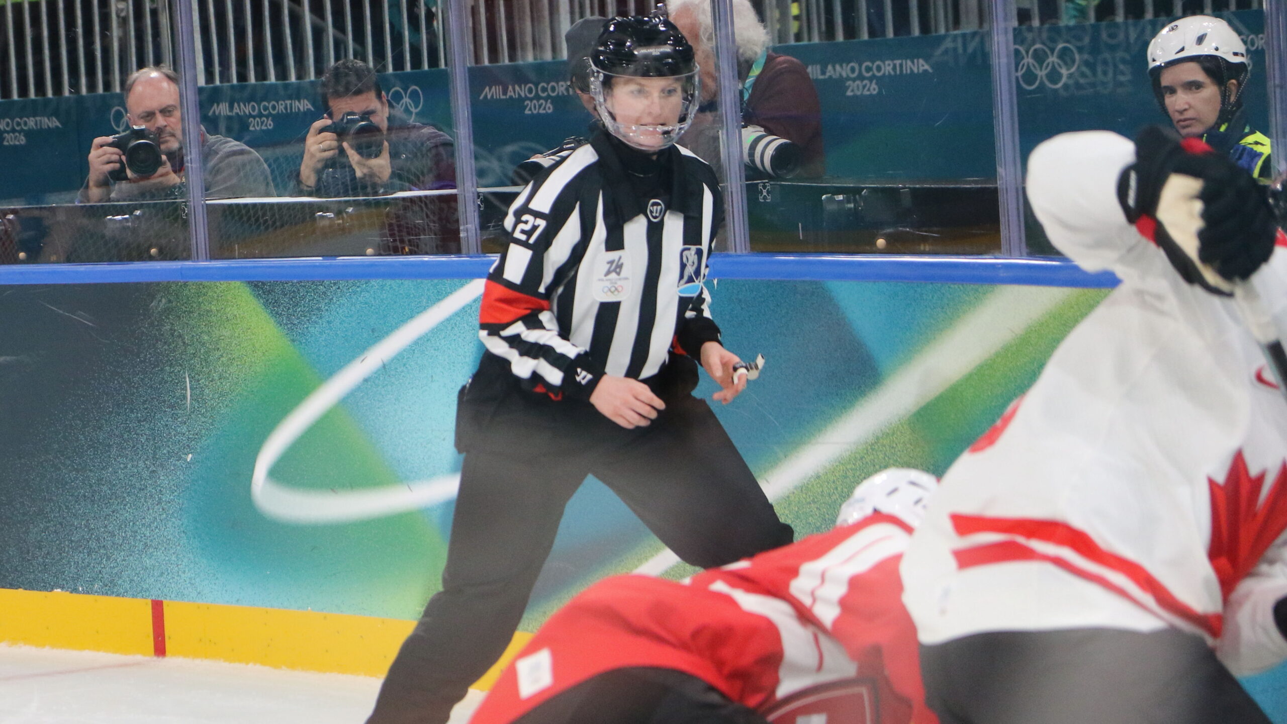 a6T4A0525 7. Februar 2026 2560 × 1440 Saskia Maurer zog Team Canada lange den Nerv Referee Julia Kainberger, Olympic Games 2026 Womens Hockey SUI – CAN, Milano Rho Ice Park, © Puckfans.at / Andreas Robanser