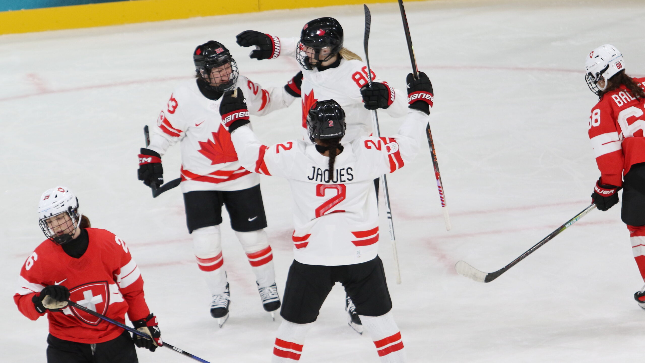 Naemi Herzig #26, Erin Ambrose #23, Julia Gosling #88, Sophie Jaques #2, Leoni Balzer #68, Olympic Games 2026 Womens Hockey SUI – CAN, Milano Rho Ice Park, © Puckfans.at / Andreas Robanser