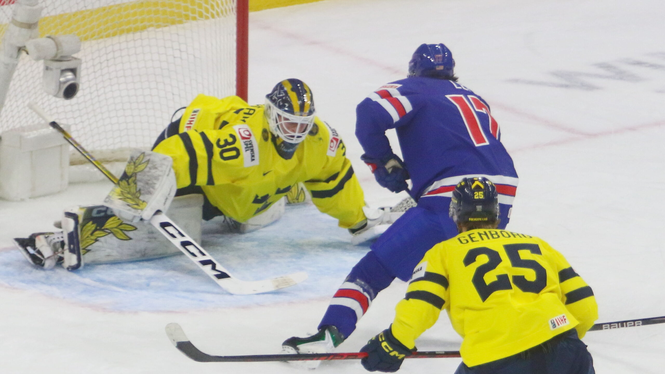 Love Härenstam #30, Ryker Lee #17, Eddie Genborg #25, World Juniors 2026 USA – SWE, Grand Casino Arena, Saint Paul © Puckfans.at / Andreas Robanser