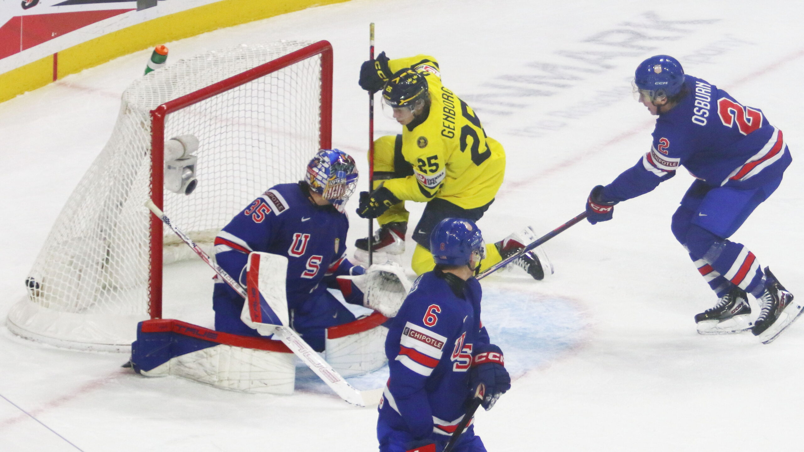 6T4A5249 1. Januar 2026 2560 × 1440 Schweden fertigt die USA ab Brady Knowling #35, Eddie Genborg #25, Adam Kleber #6, Luke Osburn #2, World Juniors 2026 USA – SWE, Grand Casino Arena, Saint Paul © Puckfans.at / Andreas Robanser