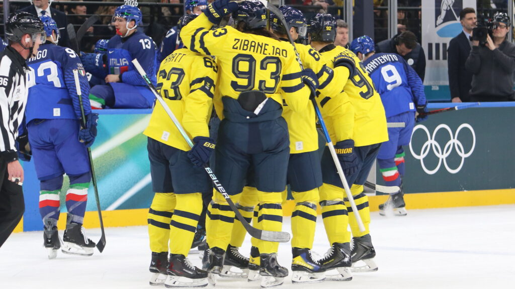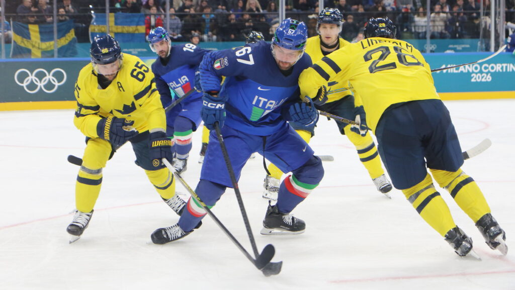 Im zweiten Spiel konnte der Unterschied nicht größer sein. Schweden mit einen Kader voller NHL Spieler gespickt traf auf den Gastgeber dieser Spiele Italien. Diese haben keinen einzigen aktuellen NHL Spieler im Kader. So holten die Schweden auch gleich einmal Schwung doch den ersten Treffer erzielten die Italiener. Dieser war aber mehr als unterhaltsam, ein Rückpass auf Filip Gustavsson ließ dieser bei der Abwehr den Schläger fallen und dies nutzte Luca Frigo natürlich zu diesem 1:0 Gastgeschenk.