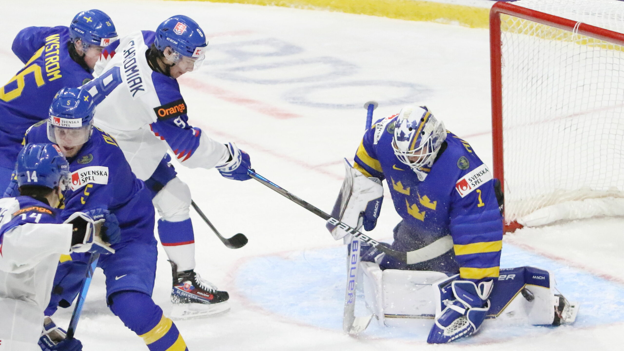 6T4A9303 28. Dezember 2021 2560 × 1440 Schweden ringt die Slowakei nieder IIHF World Juniors 2022 SWE – SVK Joel Nyström #26, Martin Chromiak #8, Anton Olsson #5, Jesper Wallstedt #1 Peavey Mart Centrium, Red Deer © Puckfans.at/Andreas Robanser