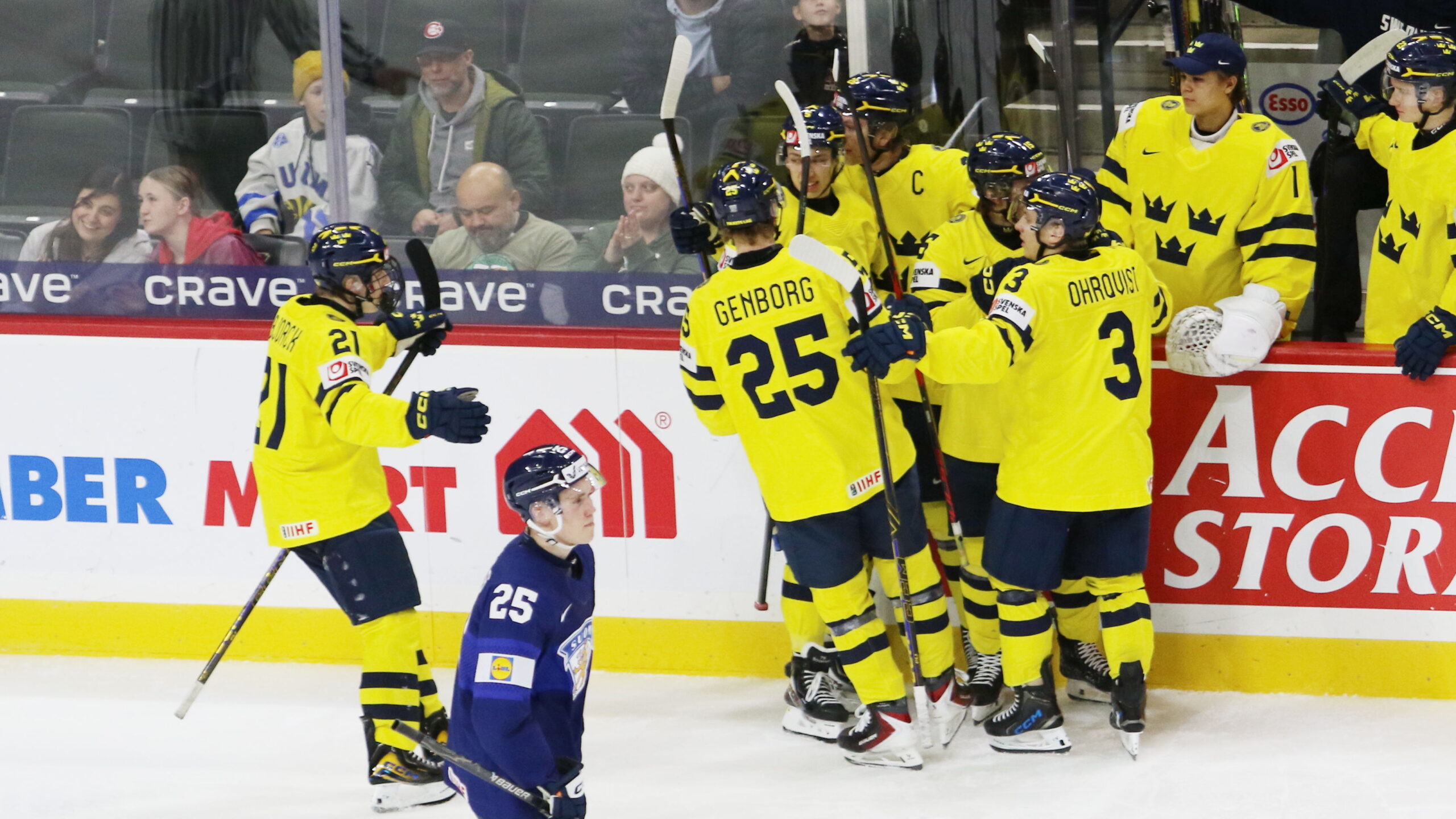 Viggo Björck #21, Lasse Boelius #25, Eddie Genborg #25, Jack Berglund #26, Felix Öhrqvist #3, World Juniors 2026 SF SWE – FIN, Grand Casino Arena, Saint Paul © Puckfans.at / Andreas Robanser
